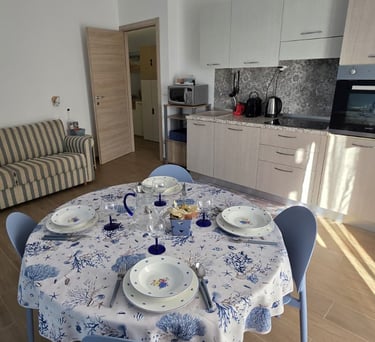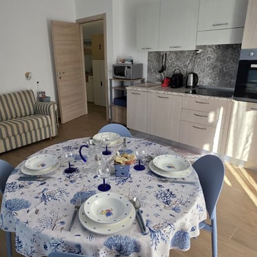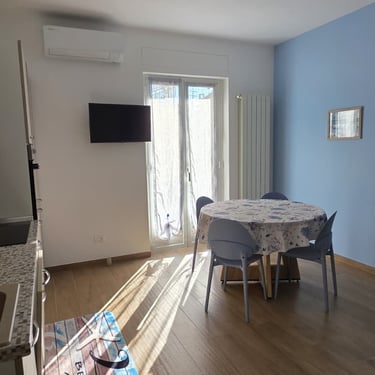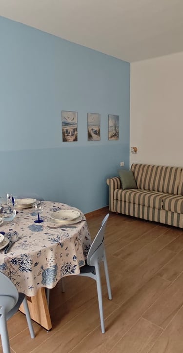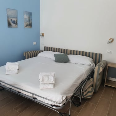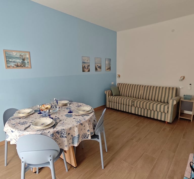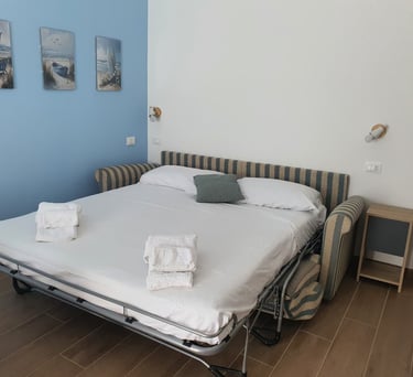 Accogliente soggiorno con divano letto matrimoniale. Dalla finestra si accede al balcone sul quale troverete tavolo e due sedie per una colazione all'aperto