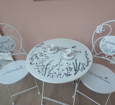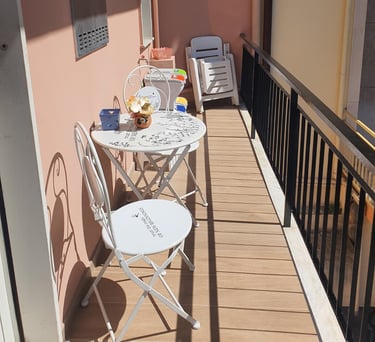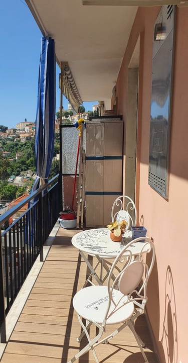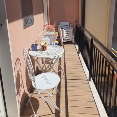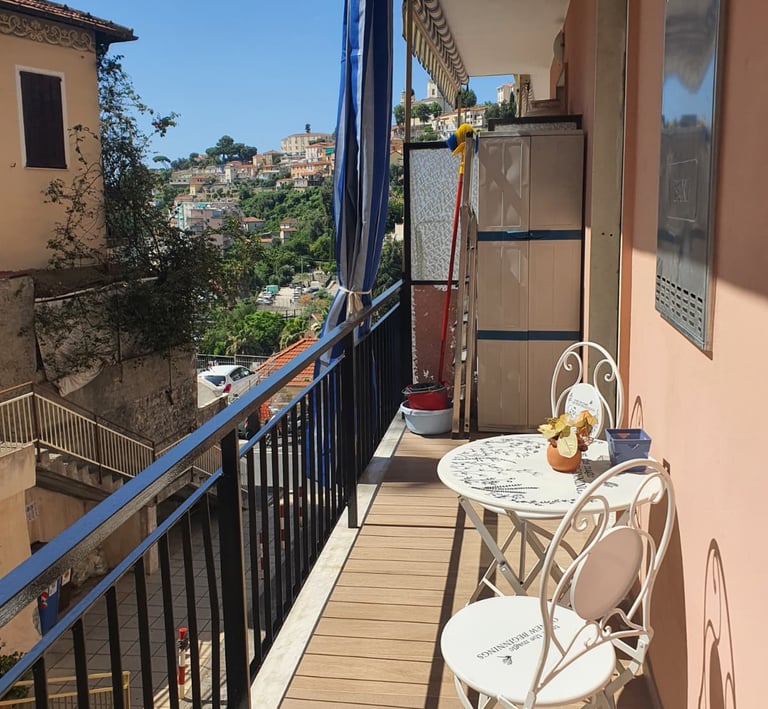 Balcone con affaccio su strada laterale con tavolino e due sedie per una colazione al sole con vista sulla città e uno scorcio di mare.
