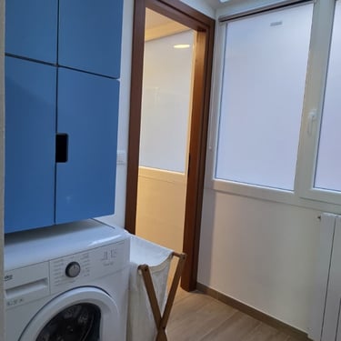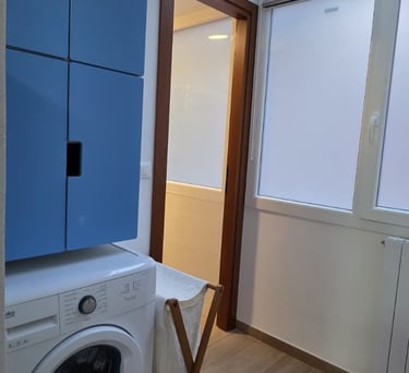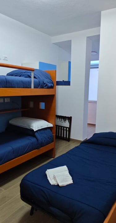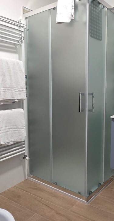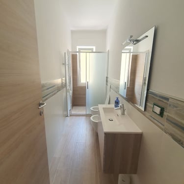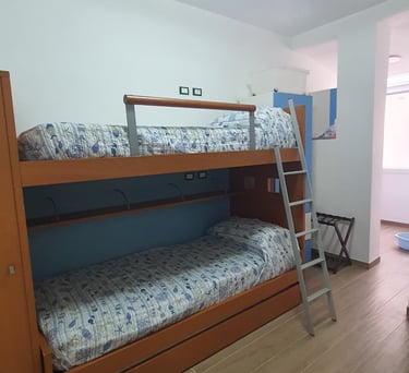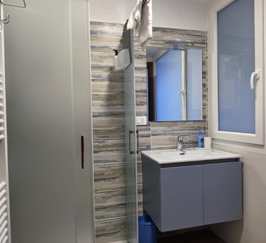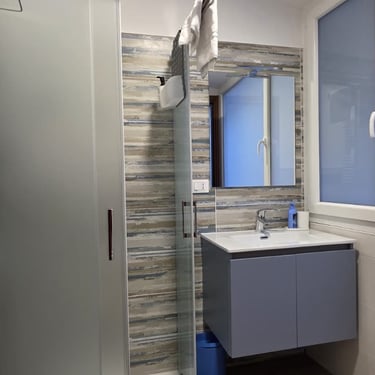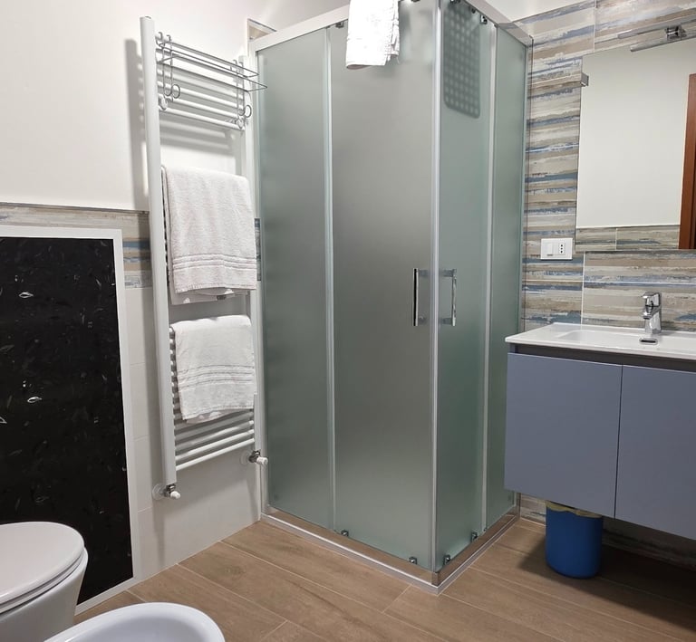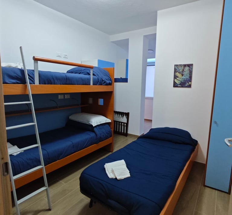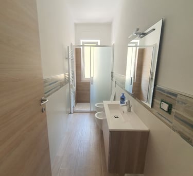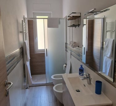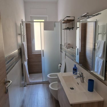 Questo bagno è al servizio della camera con tre posti letto ed è anticipato da un locale lavanderia con lavatrice, asse da stiro e ferro da stiro.