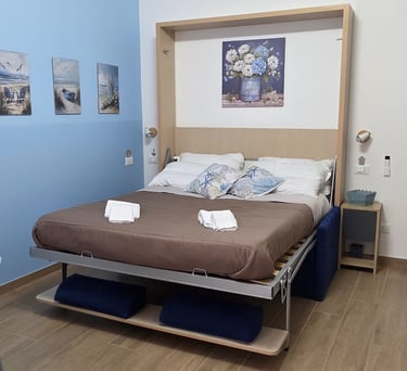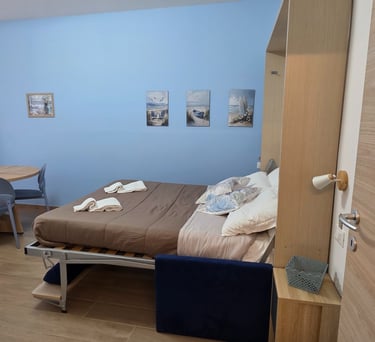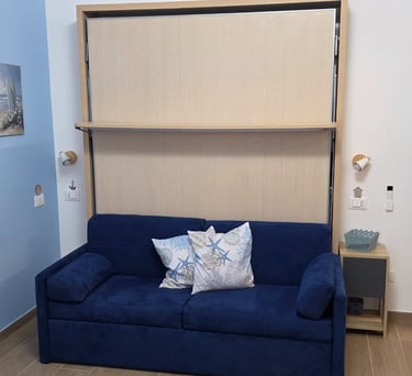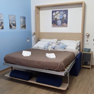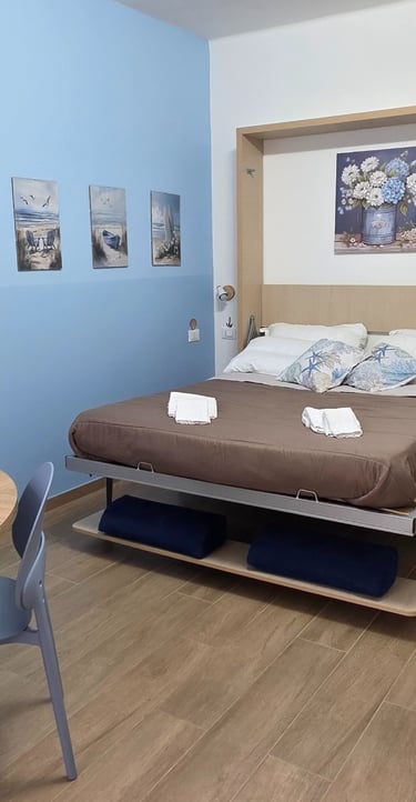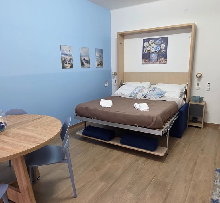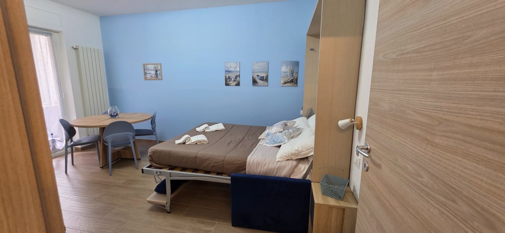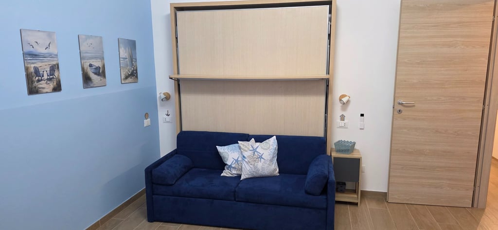 Accogliente soggiorno con divano letto matrimoniale. Dalla finestra si accede al balcone sul quale troverete tavolo e due sedie per una colazione all'aperto